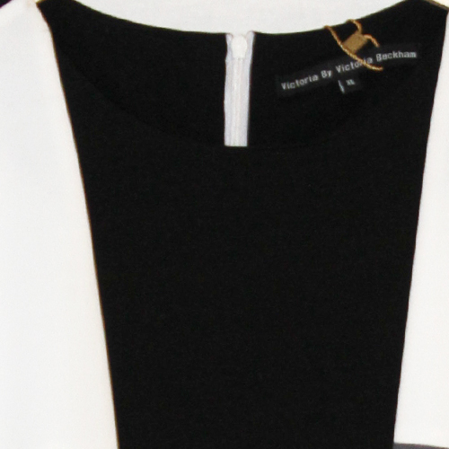 Black and white dress with geometric cut.