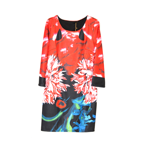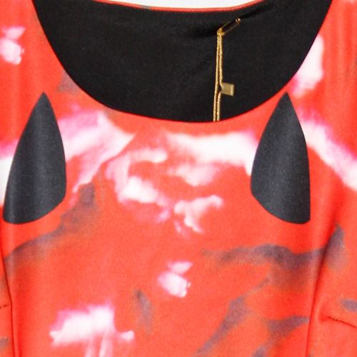 Red dress with graphical print.